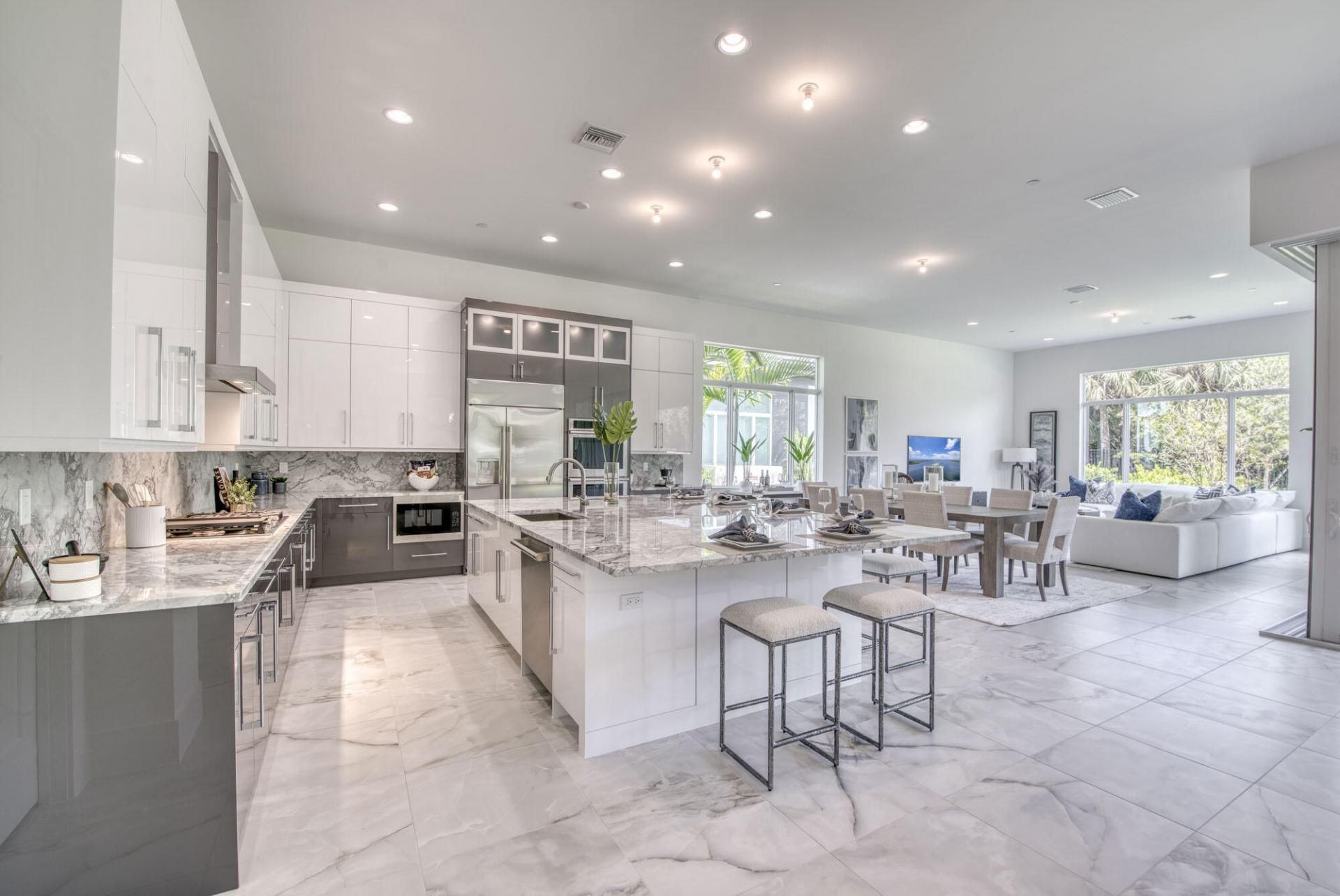 Edit mortgage details for a more accurate paymentWelcome to this stunning new construction Kenco-Cozumel modern home, never lived in and packed with luxurious upgrades. From the moment you enter, you'll be captivated by the sleek 24x24 porcelain tile flooring, modern LED lighting, and soaring 12-foot ceilings that exude elegance and openness. The great room features expansive 90 degree glass sliders, seamlessly blending indoor and outdoor living. The kitchen is a chef's dream, with Moda glossy, double-stacked cabinets, quartzite countertops, and a premium GE Monogram appliance suite. The den/office provides a versatile space with glossy porcelain tile flooring, high ceilings, and abundant natural light, perfect for work or relaxation. The primary bedroom is a private sanctuary, showcasing 12-foot ceilings, large windows with serene backyard views, and spacious walk-in closets. Guest bedrooms offer plush carpeting, en-suite bathrooms, walk-in closets, and thoughtful privacy from the main living areas. The lanai is designed for outdoor enjoyment, featuring tile pavers, a summer kitchen area with sink and gas rough-ins, and electrical connections for easy customization. This home epitomizes modern luxury, delivering a truly unparalleled living experience.